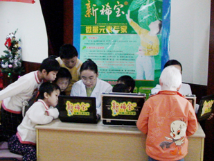 我企業(yè)董事長湯傳忠先生與福利院兒童的合影      我企業(yè)員工正在為福利院兒童進行微量元素檢測