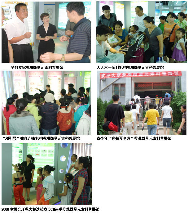 我企業(yè)投資建設(shè)了山東省乃至全國(guó)第一個(gè)微量元素科普展館,并免費(fèi)向社會(huì)開放。展館內(nèi)圖文并茂、形象生動(dòng),解說(shuō)員向每一位來(lái)參觀的人講解微量元素科學(xué)的進(jìn)展,微量元素在人體中的重要作用,微量元素和人體的健康、亞健康、疾病、長(zhǎng)壽、智力及美容的關(guān)系,微量元素如何科學(xué)補(bǔ)充,等等。展館對(duì)外開放1年多以來(lái),接待來(lái)賓上萬(wàn)人次,反映效果非常好,微量元素與健康的關(guān)系越來(lái)越被社會(huì)重視。