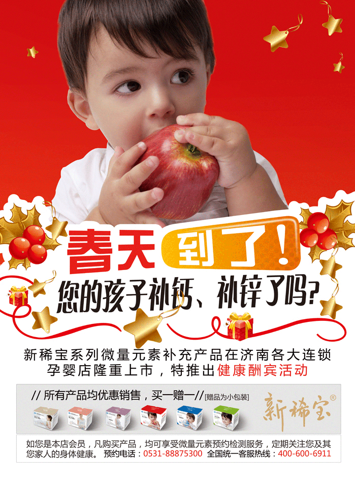 新稀寶系列微量元素補(bǔ)充產(chǎn)品在濟(jì)南疙瘩連鎖孕嬰店隆重上市,特推出健康酬賓活動(dòng)。新稀寶牌鋅硒寶片兒童裝/孕婦裝,體恒健牌鈣之緣片兒童裝/孕婦裝,體恒健牌鐵之緣片兒童裝/孕婦裝優(yōu)惠活動(dòng)買一贈(zèng)一,凡購買產(chǎn)品者均可享受微量元素預(yù)約免費(fèi)檢測(cè)服務(wù)。新稀寶全國客服統(tǒng)一熱線:400-600-6911。