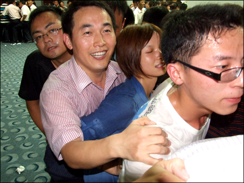 在講到“泛愛眾”這個(gè)章節(jié)時(shí),任老師與大家分享了一個(gè)“同甘共苦”的互動(dòng)游戲,他把現(xiàn)場(chǎng)人員分為12個(gè)組,每隊(duì)12至15人不等,大家并排站好,拼成一個(gè)緊湊的圓圈,每個(gè)隊(duì)員依次坐在后一位隊(duì)員的腿上,哪隊(duì)堅(jiān)持的時(shí)間長(zhǎng)哪隊(duì)就獲勝。開始時(shí)大家還感覺很輕松,隨著時(shí)間一分一秒的過去,疼痛感漸漸襲來,大家開始感覺體力不支,這時(shí)會(huì)議室的空調(diào)也停止運(yùn)轉(zhuǎn),七月的濟(jì)南,正是最熱的時(shí)候,不一會(huì)兒,大家就大汗淋漓。