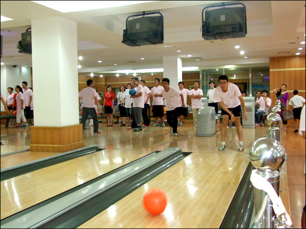 保齡球又叫“地滾球”,起源于德國(guó),是一種在木板球道上用球滾擊木瓶的室內(nèi)體育運(yùn)動(dòng)。比賽現(xiàn)場(chǎng),大家在工作人員的引導(dǎo)下,換上專業(yè)的保齡球鞋,做完熱身運(yùn)動(dòng)和結(jié)束練習(xí)后,開始了比賽。很多員工一上手就能看出是“保齡健將”,拿球、下蹲、大鵬展翅式的扔球動(dòng)作,動(dòng)作標(biāo)準(zhǔn)、嫻熟、到位,一球命中,引起現(xiàn)場(chǎng)人員一陣歡呼,很快成為比賽場(chǎng)上的“明星”;接下來(lái)“眾相百出”: 有的因?yàn)椤笆д`”而頓足捶胸,有的因?yàn)椤靶疫\(yùn)”而洋洋得意——比賽氣氛也由之前的輕松活躍變得緊張激烈,大家你爭(zhēng)我奪、毫不示弱,慢慢地進(jìn)入了白熱化階段,最終山西區(qū)域的毛潔銀、河南區(qū)域的常紅星分別榮獲了女子組和男子組的冠軍。