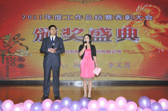 大會(huì)現(xiàn)場(chǎng) 財(cái)務(wù)部經(jīng)理馮小龍和網(wǎng)絡(luò)部李文芳主持了此次盛典
