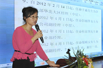 接下來,人力資源部經(jīng)理于鳳仙女士上臺(tái)宣讀了《2012年機(jī)構(gòu)調(diào)整及人事任免決定》。隨后,湯經(jīng)理上臺(tái)為新任命的12名管理人員頒發(fā)了任命書。接過紅燦燦的任命書,同時(shí)也接過一份沉甸甸的責(zé)任,大家紛紛表示:一定不辜負(fù)公司領(lǐng)導(dǎo)的重托與信任,在新的崗位一定會(huì)再接再厲,繼續(xù)努力,為公司發(fā)展做出更大的貢獻(xiàn)!