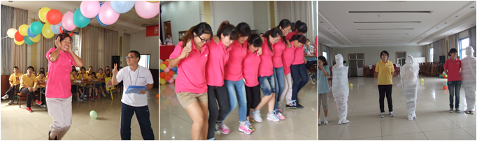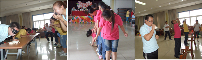 待裁判員宣讀完比賽規(guī)則后,大家都躍躍欲試,蓄勢待發(fā),活躍的氣氛到處可見。第一個項目是“輕松扎氣球”,要求各個方隊1名隊員參與比賽,身高限于1.6米以下的女生,參賽隊員將別有細針的發(fā)卡戴在頭上,聽到比賽口令后,用發(fā)卡頂球的方式將垂掛在天花板下方的氣球頂破,在規(guī)定的時間內,扎破氣球最多的獲勝。開始時,參賽隊員沒有充分掌握比賽技巧,發(fā)夾的細針沒有對準氣球,跳了幾次不得要領,周圍助威的同事,有不斷出點子的,有吶喊助威的,有總結別人經驗的,有加緊練習的,還有捧腹大笑的,場面很是熱鬧。參賽隊員經過調整,順利、公平地比完了第一個項目。