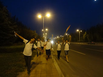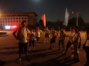 在第一集結(jié)點(diǎn)稍作休息后,各小組迅速向下一個(gè)目標(biāo)行進(jìn)。腳步雖然相比之前有絲勞累和沉重,但胸中的激情卻越來越旺盛。在第二集結(jié)點(diǎn)——邢村立交橋,后勤支持人員為大家準(zhǔn)備了紅牛補(bǔ)充體力。簡單的休整之后,大家繼續(xù)前進(jìn)。體力經(jīng)過前期的消耗,大家的身體開始出現(xiàn)了疲憊,步伐也沉重起來,有的人腳上已經(jīng)磨出了水泡,但卻沒有一個(gè)人喊苦喊累,沒有一個(gè)人停止繼續(xù)前行的腳步,因?yàn)榇蠹抑溃簞倮驮谇胺?因?yàn)榇蠹倚闹杏幸粋€(gè)信念:不能輕言放棄,不達(dá)目的誓不罷休。