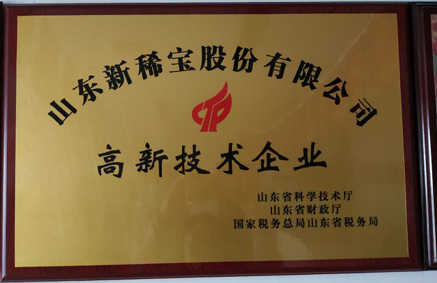 2018年,山東新稀寶股份有限公司被山東省科學(xué)技術(shù)廳、山東省財政廳、國家稅務(wù)總局山東省稅務(wù)局評為“高新技術(shù)企業(yè)”