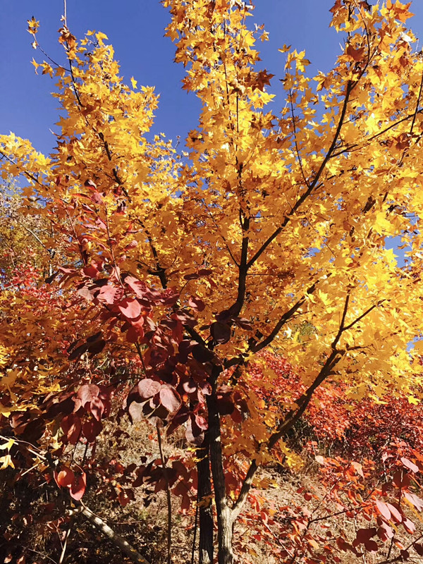 金秋時(shí)分,沿著山脊邊走邊欣賞紅葉,在山頂眺望紅葉谷別有一番景色。此時(shí)紅葉谷換上了富麗的盛裝,層林盡染,深淺相間,翠綠、橙黃、殷紅,相互交織,錯(cuò)落有致,令人眼花繚亂。