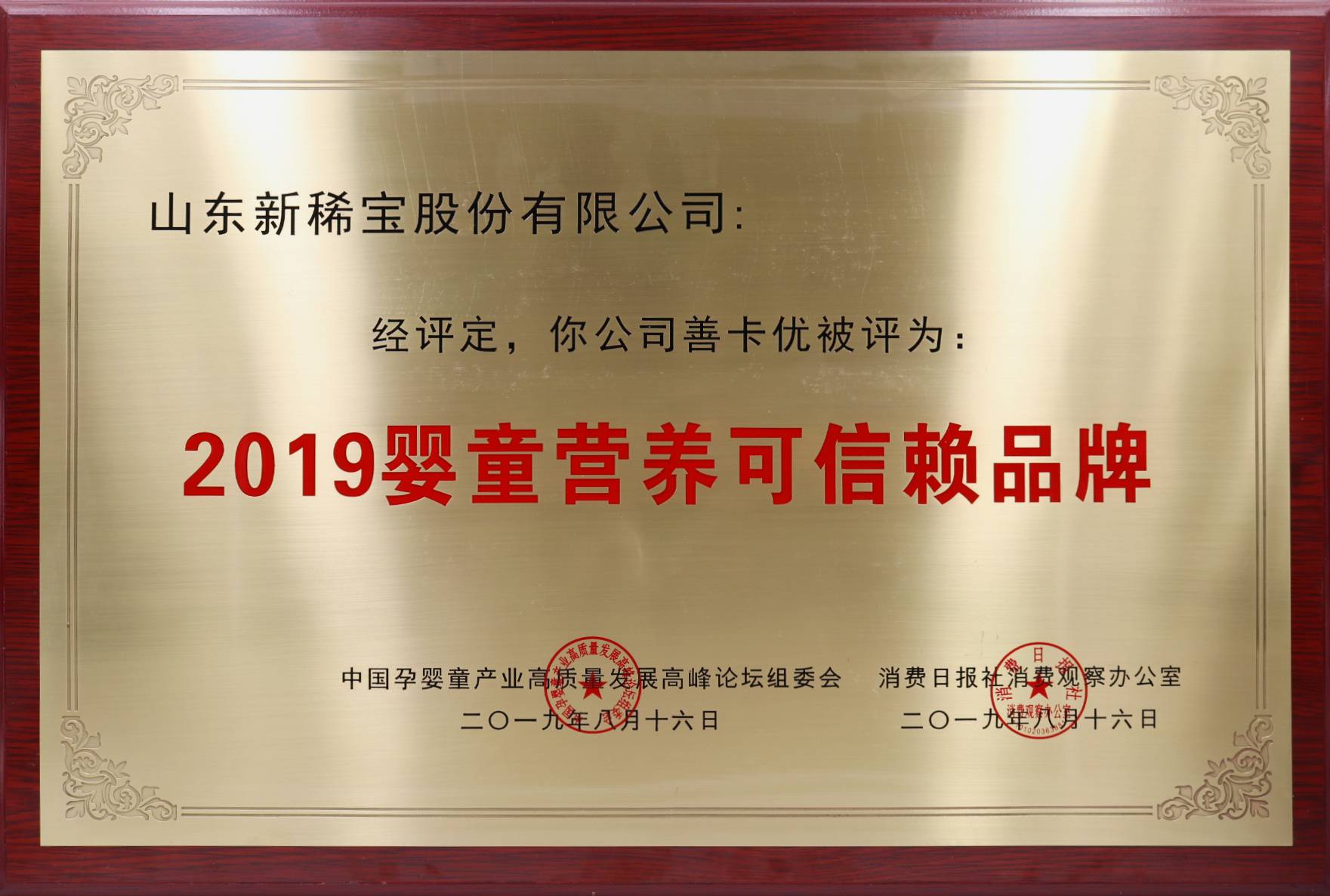 2019年8月  “善卡優(yōu)”被消費(fèi)日?qǐng)?bào)、中國(guó)孕嬰童產(chǎn)業(yè)高質(zhì)量發(fā)展高峰論壇組委會(huì)評(píng)為“2019嬰童營(yíng)養(yǎng)可信賴品牌”
