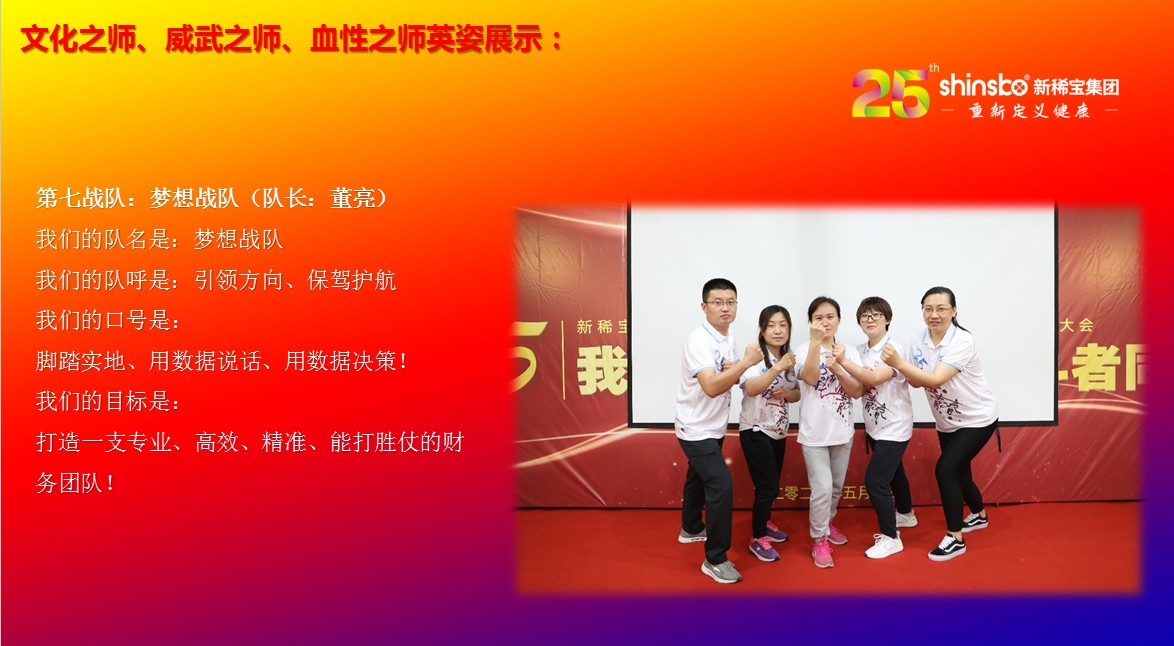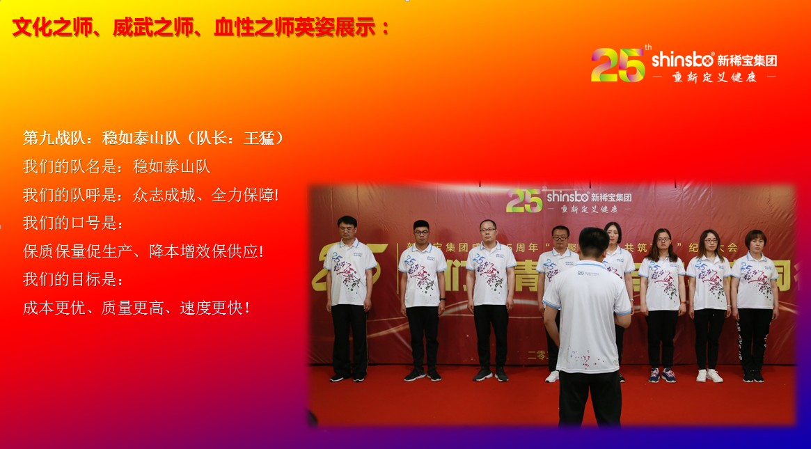在文化儀式后緊接著舉行了隆重的“文化之師、威武之師、血性之師” 誓師大會(huì)。各戰(zhàn)隊(duì)步入會(huì)場就被熱烈的現(xiàn)場氛圍所感染,主屏展架抒寫“25我們正青春”與奮斗者同行的格言,大紅背景墻點(diǎn)綴出新稀寶集團(tuán)“相聚攜手 共筑百年”25周年紀(jì)念大會(huì)”活動(dòng)主題,兩條大氣宏偉、耀眼奪目橫幅 “增強(qiáng)緊迫感、聚焦主戰(zhàn)場、打好翻身仗;抓住新機(jī)遇、創(chuàng)造新優(yōu)勢、再創(chuàng)新輝煌”為誓師大會(huì)營造了良好戰(zhàn)斗氛圍,使各戰(zhàn)隊(duì)、各戰(zhàn)將從視覺上、思想上、感知上,感受到公司的凝聚力、向心力、變革力、戰(zhàn)斗力。