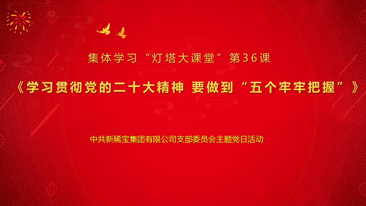 11月17日下午,新稀寶黨支部組織學習“燈塔大課堂”第36課《學習貫徹黨的二十大精神,要做到“五個牢牢把握”》。本次學習由集團黨支部書記鄭朝霞主持,參加學習的有支部組織委員于鳳仙,支部黨員、預備黨員、入黨積極分子和部分群眾代表。