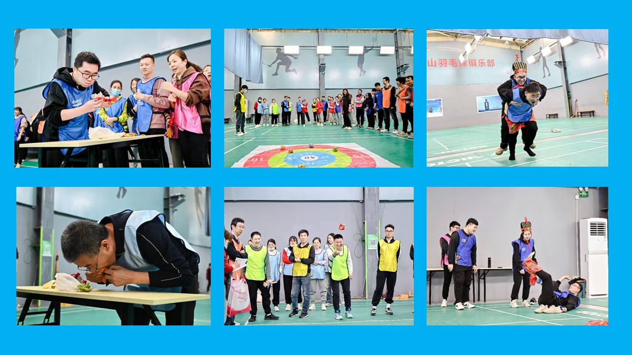 接下來(lái)是水果大戰(zhàn),大家囫圇吞棗般吞下了各自挑選的水果,只要速度不要風(fēng)度。跳繩大賽項(xiàng)目,第一輪是單人指壓板跳,那其中的酸爽滋味,只有運(yùn)動(dòng)員本人能體驗(yàn)了。男女混合跳,一男一女,平時(shí)可能沒(méi)有交流過(guò)的同事,現(xiàn)在需要面對(duì)面,看著對(duì)方近在咫尺,想跳更想笑。扔沙包項(xiàng)目看似簡(jiǎn)單,但想拿分還是必須有點(diǎn)技巧在身上,運(yùn)動(dòng)高手頻頻失手,平時(shí)的林妹妹屢刷新高,讓人看不到最后都猜不出結(jié)果。愛(ài)的魔力轉(zhuǎn)圈圈,一根布條,纏住了兩個(gè)人,轉(zhuǎn)起來(lái)的姿勢(shì),有人像跳舞美觀優(yōu)雅,有人像大猩猩笨拙搞笑;轉(zhuǎn)完后有人還能跑直線,速度不遜平時(shí),有人像醉酒一樣?xùn)|倒西歪,找不清方向。徒手競(jìng)速趣味性十足,一塊小小的糖果系在紅繩上,只能靠嘴巴吃掉,糖果晃來(lái)晃去,人也跟著晃東晃西,看著滑稽搞笑,各種表情包層出不窮;另一位隊(duì)員徒手穿褲子,東北味道十足的大花褲衩,配上甩腳蹬腿扭腰提臀一系列腿部運(yùn)動(dòng),偶像包袱碎了一地,周圍觀眾哈哈大笑,拍腿抹淚好不熱鬧。